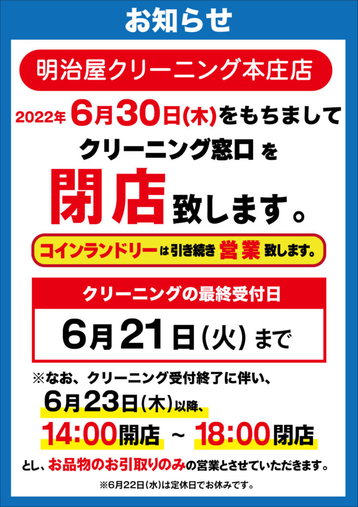 本庄店クリーニング受付窓口閉店のお知らせ