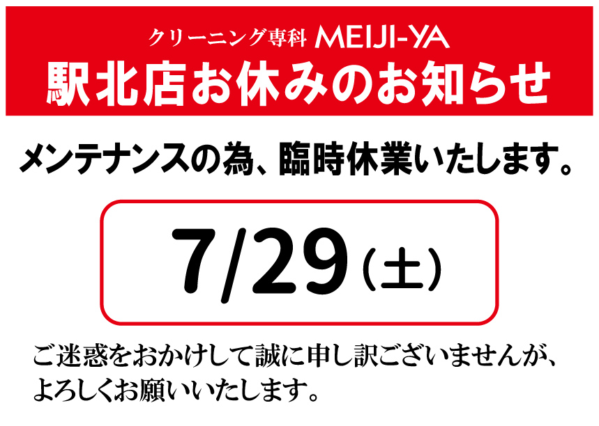 7/29(土)駅北店はメンテナンスの為、臨時休業いたします。