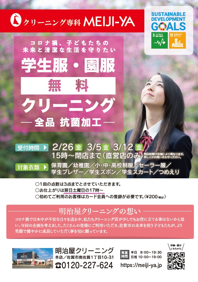 ご好評につき、先日から行っている「学生服無料クリーニング」キャンペーンを3月まで延長いたします❣![]()